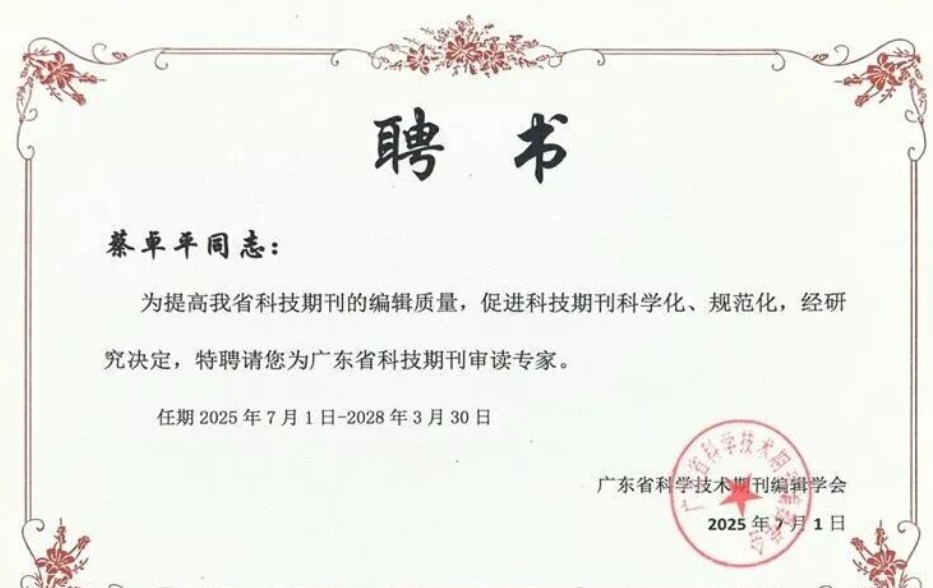 蔡卓平秘书长获聘广东省科技期刊审读专家