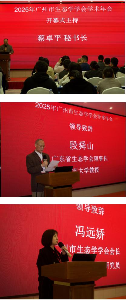 会议开幕式由学会发起人、副会长兼秘书长蔡卓平主持。广东省生态学会理事长、暨南大学教授段舜山在开幕式致辞中指出,广州作为国家中心城市与粤港澳大湾区的核心引擎,在高速发展的进程中,始终将生态文明建设置于突出位置。广州市生态学学会紧密围绕区域发展需求,在学术交流、科学普及、决策咨询等领域开展了一系列工作,为提升城市生态品质、筑牢湾区生态屏障贡献了智慧和力量。广州市生态学学会会长、华南农业大学副研究员冯远娇在致辞中回顾了2025年广州市生态学学会在推动区域生态科研、科普与实践中取得的成绩,号召会员继续深化科学研究,拓宽科普途径,积极参与科普实践,助力绿美广东生态建设。