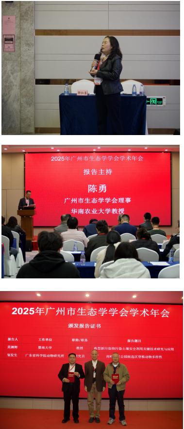 年会共安排了九场高质量学术报告,内容包括污染物治理、生物多样性保护、海湾生态环境、河湖健康评估、乡村振兴实践、环境应急联动、生态养殖技术及科普体系构建等多个前沿与热点领域,涵盖基础研究、技术应用与社会实践,形成“科研-科普-产业”闭环,充分展示了跨学科、多维度、重应用的生态学研究与实践成果。广州市生态学学会监事、华南农业大学教授郭和蓉和广州市生态学学会理事、华南农业大学教授陈勇分别主持了报告。暨南大学教授莫测辉率先分享了“典型新污染物污染土壤安全利用关键技术研究与应用”的进展工作,为城市土壤修复提供新思路,也为应对新兴环境挑战提供了科技解决方案。广东省科学院动物研究所研究员邹发生以“南岭国家公园候选区脊椎动物多样性”为题,展示了南岭丰富的生物资源及其保护价值。中国水产科学研究院南海水产研究所研究员刘华雪解析广东省海湾精细化调查数据,揭示近岸域生态环境评价的实践启示,为海岸带精细化管理提供了科学依据。中山大学博士研究生、佛山市生态学会观鸟专委会主任梁智健以“绿美佛山,人鸟共赢——佛山市生物多样性保护实践”为例,介绍了城市尺度上生物多样性保护与公众参与的成功经验。肇庆学院教授秦建桥阐述了“全国河湖健康评估技术框架与关键问题”,为河湖生态系统的科学评价与管理提供指导与支撑。广东省农业科学院植物保护研究所研究员林庆胜结合自身实践,生动讲述了“织一张网,立一根柱,活一方水土——科技特派员的协同振兴之路”,展现了科技服务乡村振兴的生态路径。深圳市绿世纪环境技术有限公司董事长黄小武探索粤港澳大湾区环境应急联动机制,为区域环境风险联防联控提出了建设性思考。暨南大学副教授付耀武介绍了“水生动物生态健康养殖保障技术研究与应用”研究进展,为水产养殖业绿色转型提供技术支撑。广东省生态学会秘书长、副理事长蔡卓平作了“生态科普工作的意义、发展及体系构建思考”的报告,系统梳理了生态科普的价值、现状与未来发展方向,提出“生态科普工作体系构建”框架,强调科普创新对提升公众生态意识的重要性。