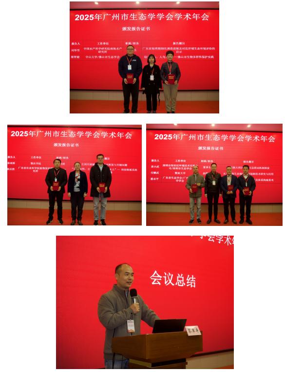 会议现场还安排了《生态科学》期刊的海报宣传推介以及布设了“揭秘微塑料——隐形的杀手”生态科普宣传系列海报。闭幕式上,来自广东省生态学会、广州市生态学学会、深圳市生态学会和佛山市生态学会的领导嘉宾分别上台向报告专家颁发了报告证书。